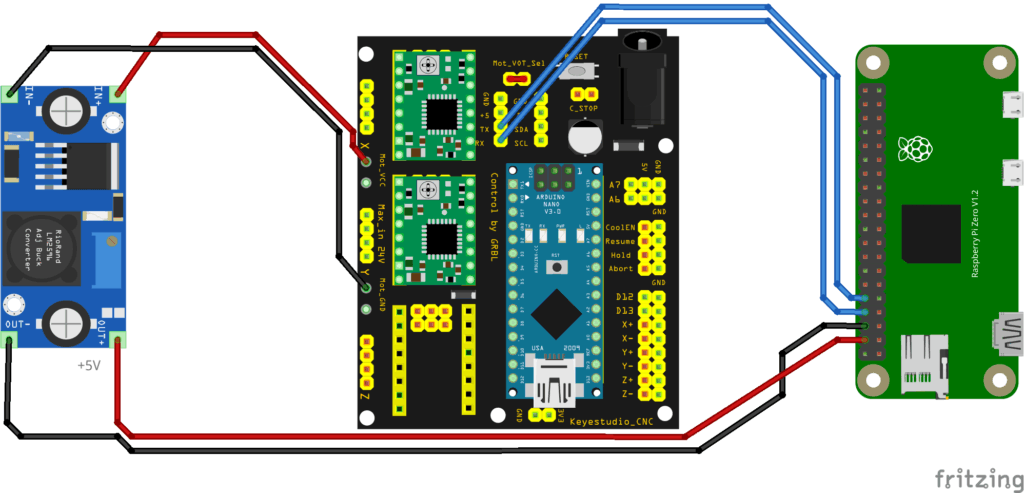 コントローラは RaspiZeroW+Arduino+CNC Shield v4 で構成する.物理的な配線は次の通り.