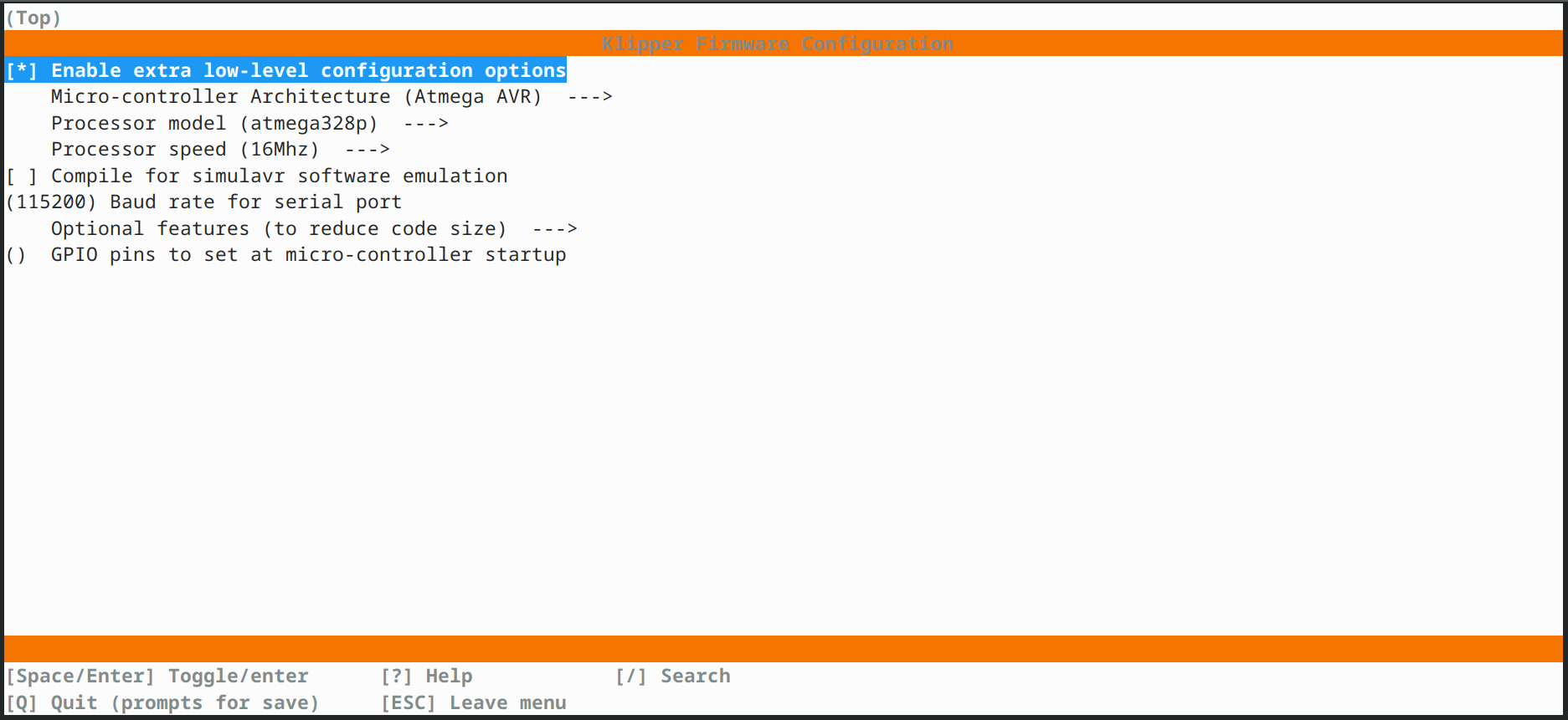 Arduino Nano 用に Klipper のファームウェアをビルドする必要がある.atmega328p に合わせて次の通り設定する.