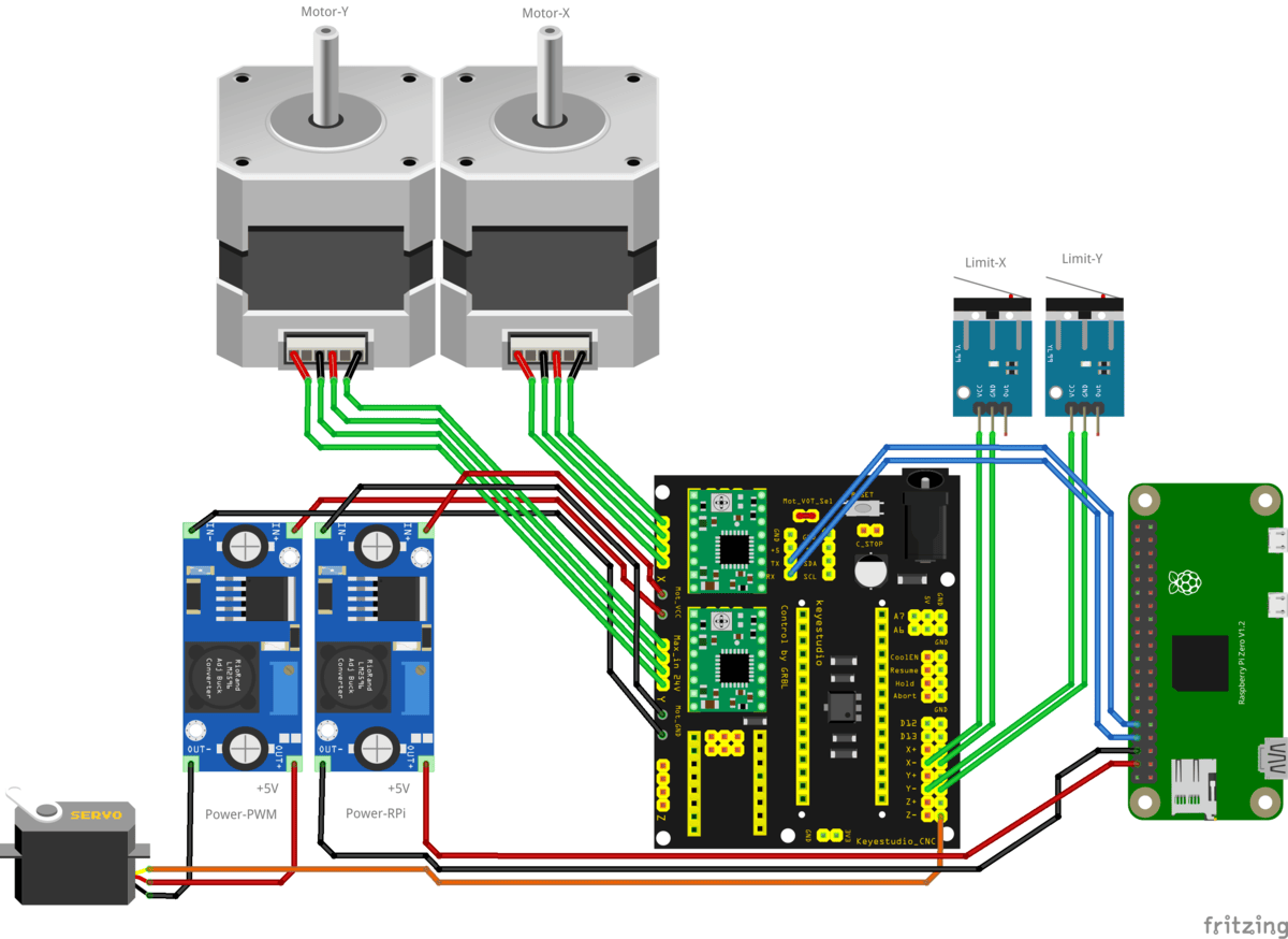 以前作った手乗りペンプロッタの構成ではArduinoとサーボの電源が共通で,サーボ駆動による電圧降下の際に動作が不安定になっていた.今回の構成ではRasPiとサーボの電源を分けて問題を解消する.