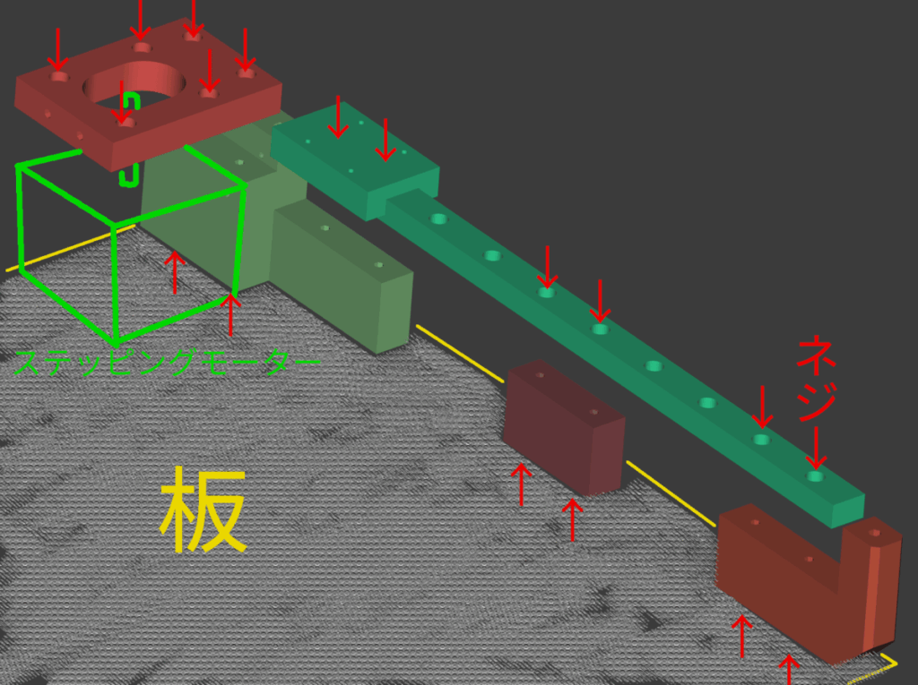 今回は300x600の板を使ったが,3Dパーツを小分けにしているのでリニアレールの長さ,板の大きさ,ベルトの長さなどに合わせて,大きさは自由に実装できるようにしてある.自分で実装する場合は入手可能な部品にあわせてお好みの大きさでどうぞ.これで基本的な構成は完成.