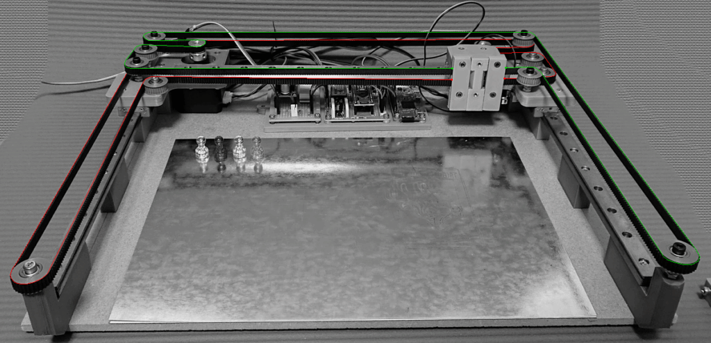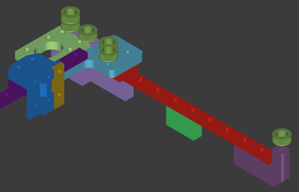 ベルトを張るとこんな感じ.構成は基本的なCoreXYなので,緑と赤のラインが左右対称になるように上下二段のプーリーをそれぞれ一周すればOK.