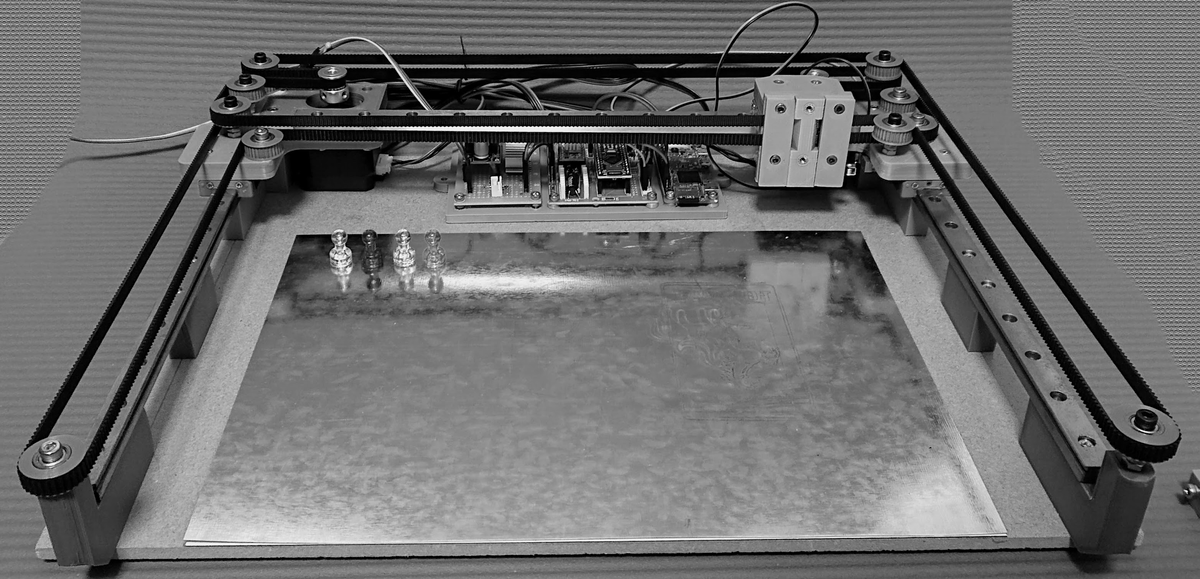 今回は300x600の板を使ったが,3Dパーツを小分けにしているのでリニアレールの長さ,板の大きさ,ベルトの長さなどに合わせて,大きさは自由に実装できるようにしてある.自分で実装する場合は入手可能な部品にあわせてお好みの大きさでどうぞ.これで基本的な構成は完成.